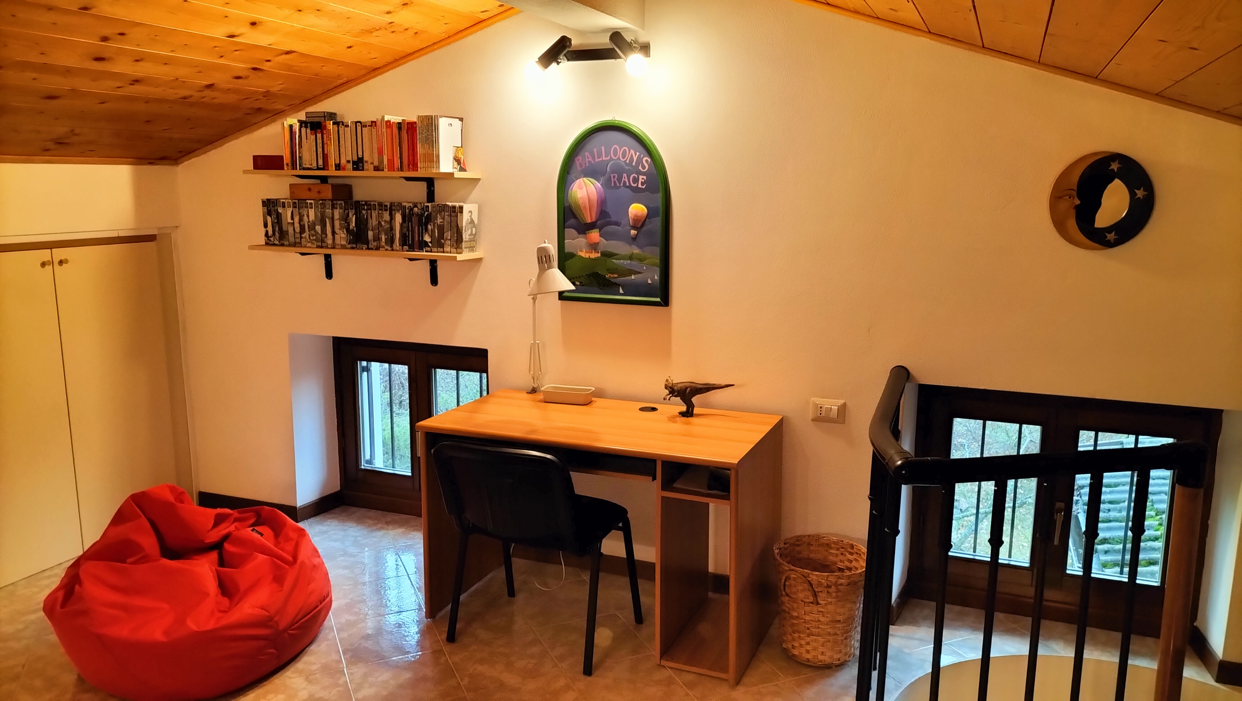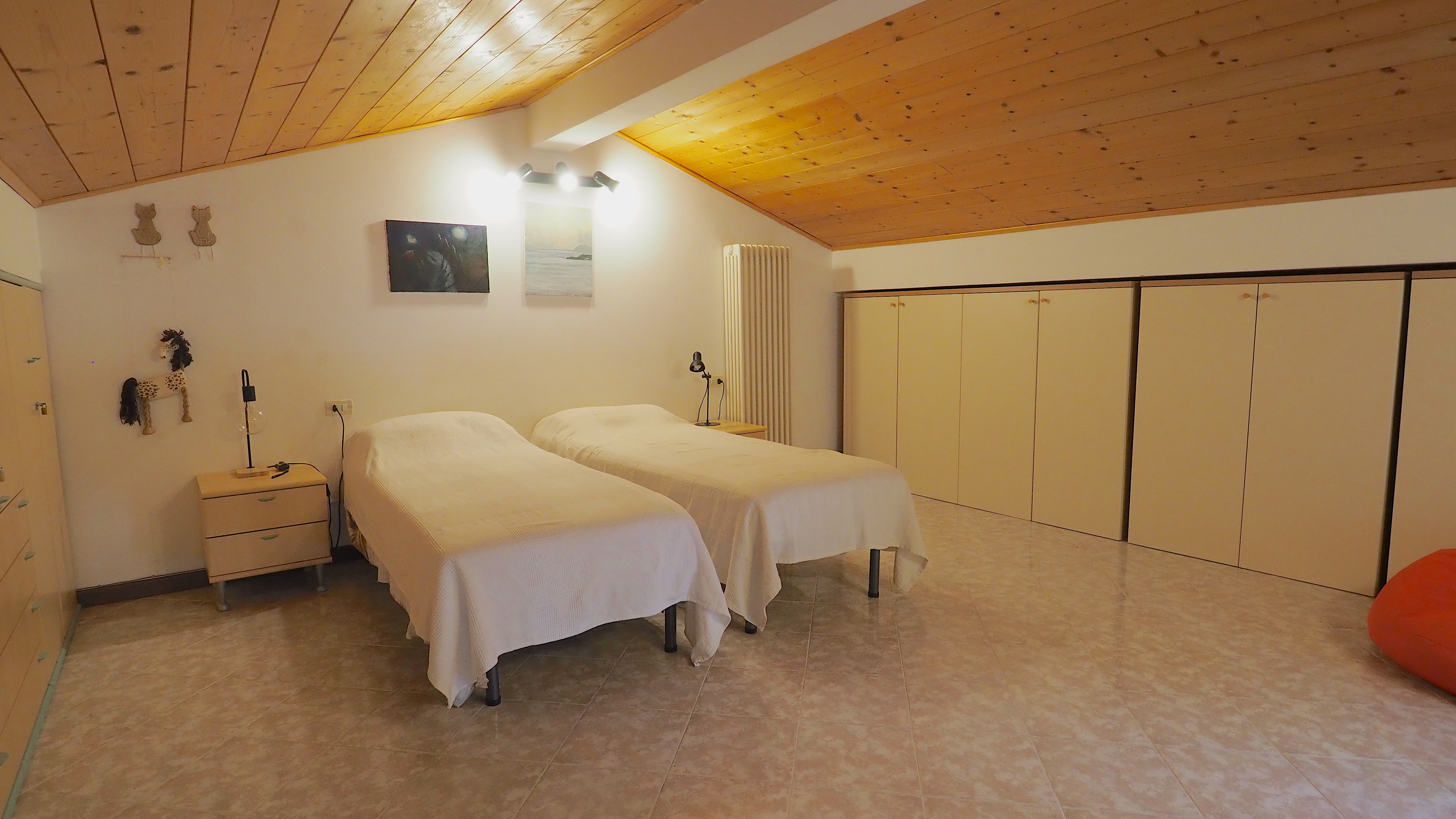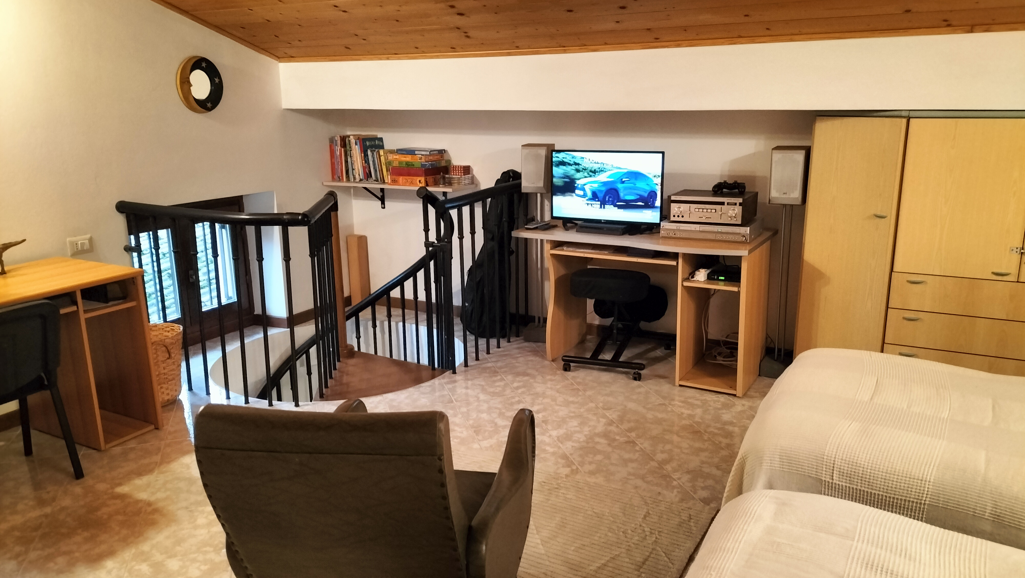 The attic consists of two beds and, upon request, an additional bed, two desks, an armchair, an 8-door wardrobe, a TV and a video game station.