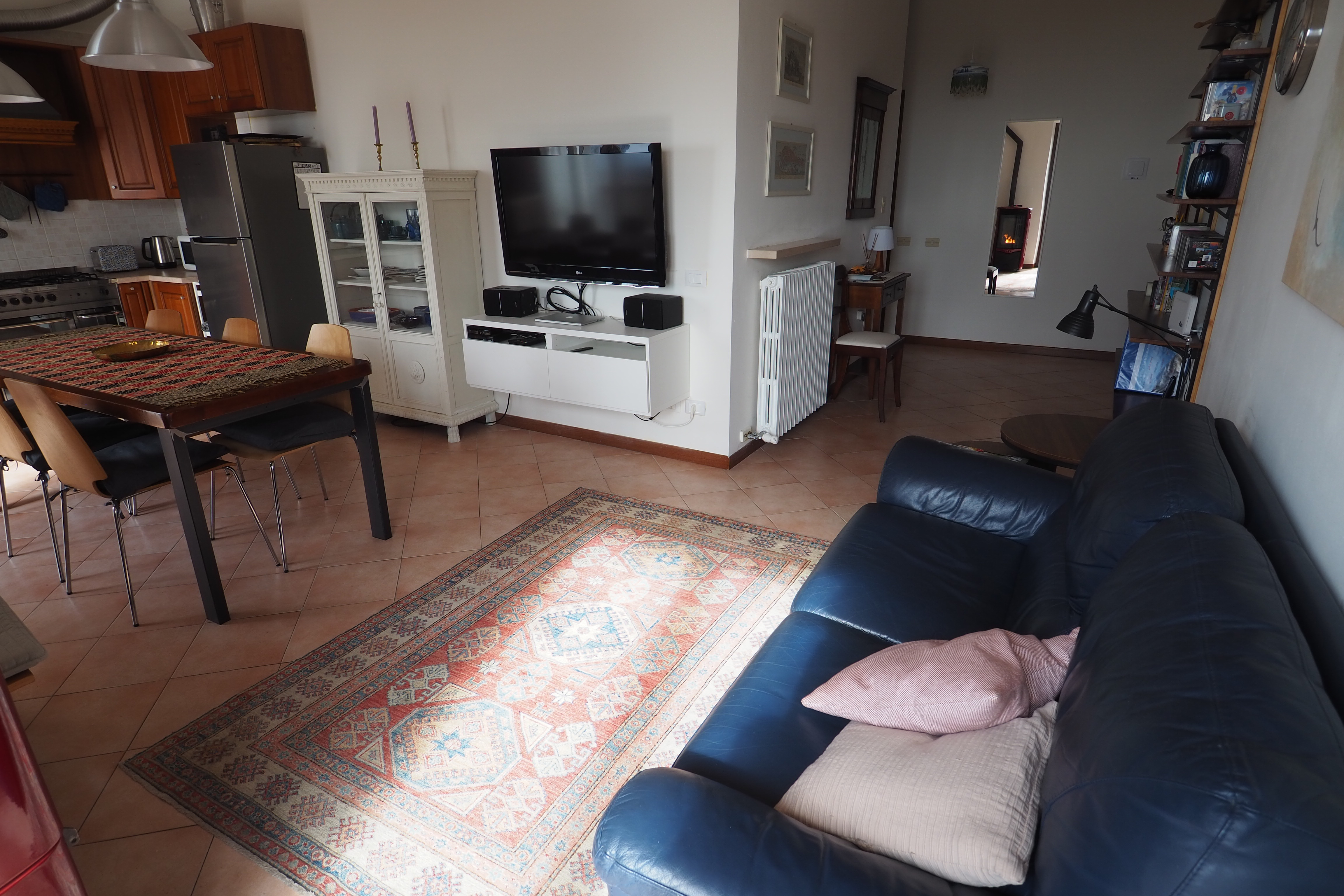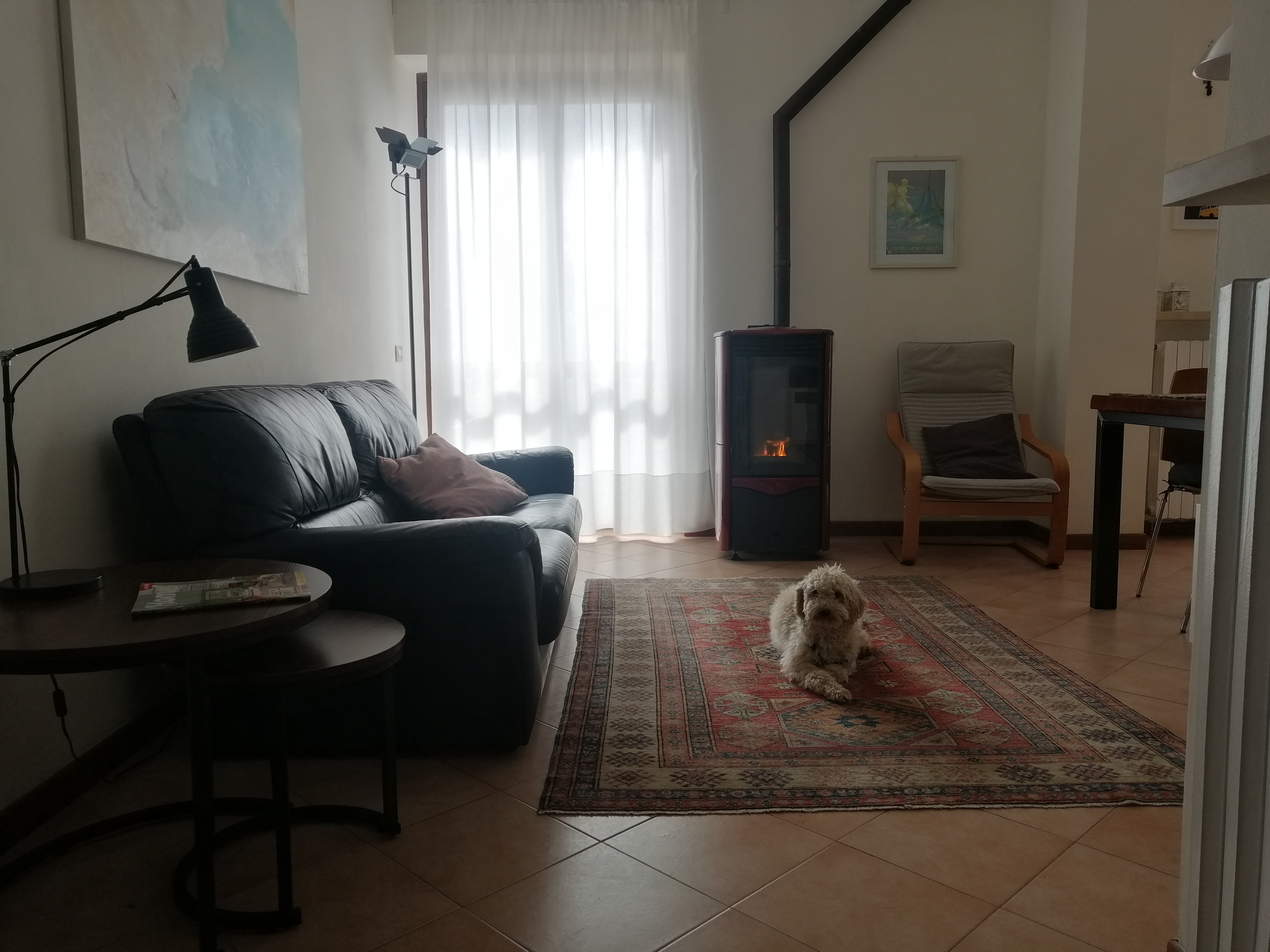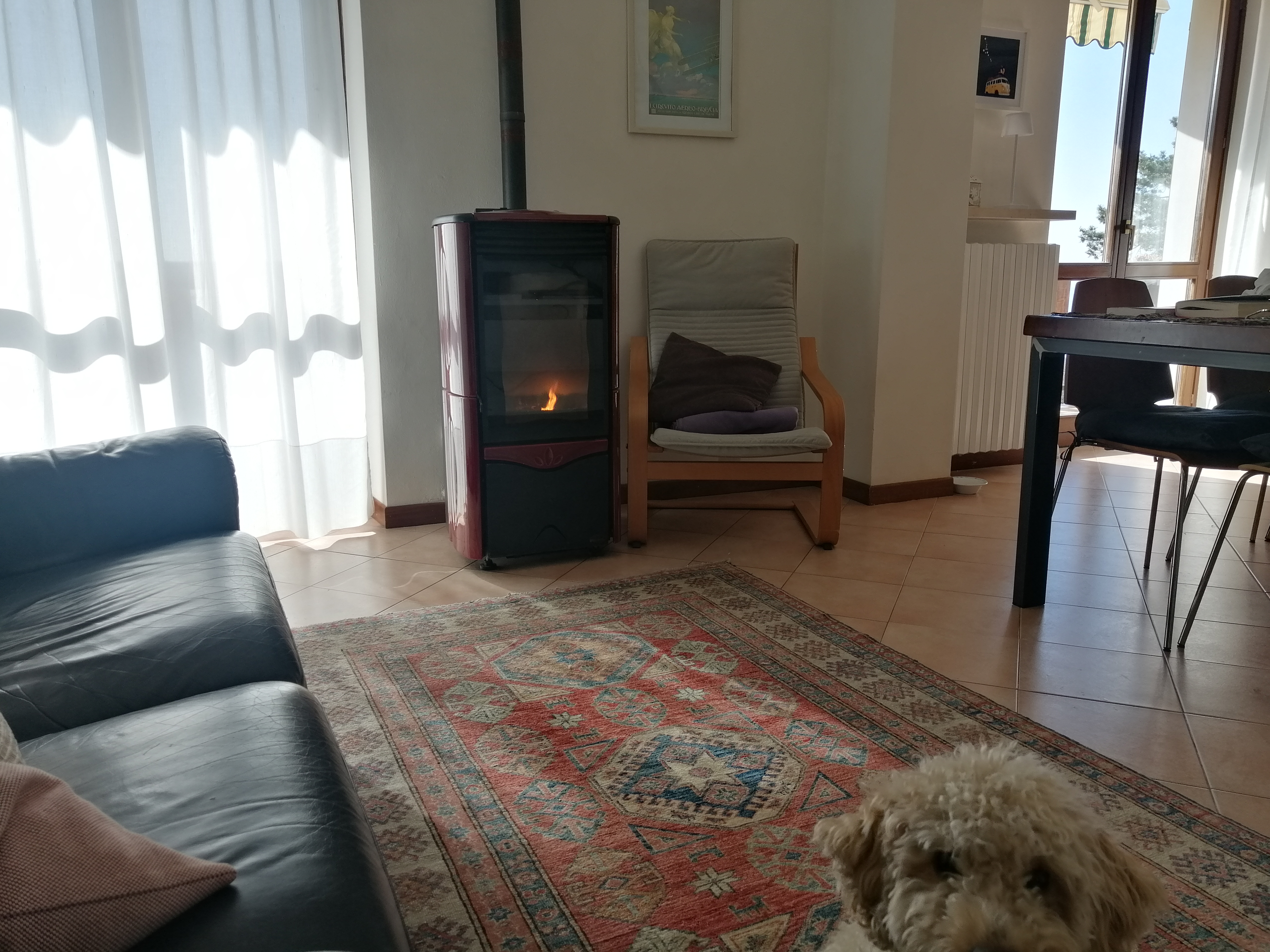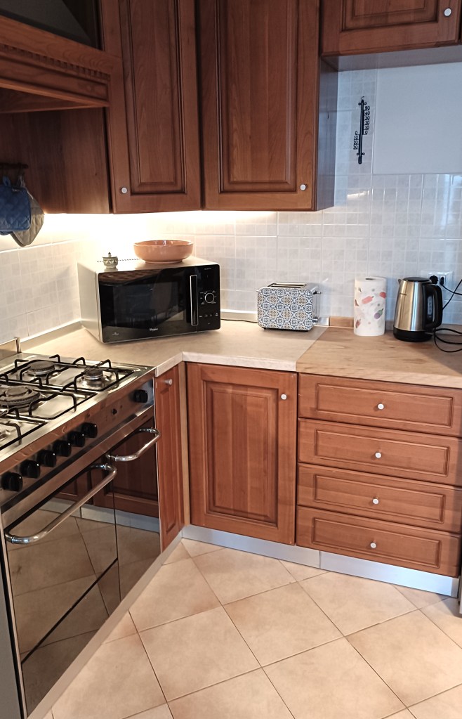 Our living room kitchen has a table with 6 seats, a three-seater sofa, an armchair, a television, a coffee table, a bookcase. The kitchen worktop is equipped with: 5-burner hob, electric oven, microwave, refrigerator, kettle, coffee machine, everything needed for cooking (plates, crockery, pots, cups, etc…)