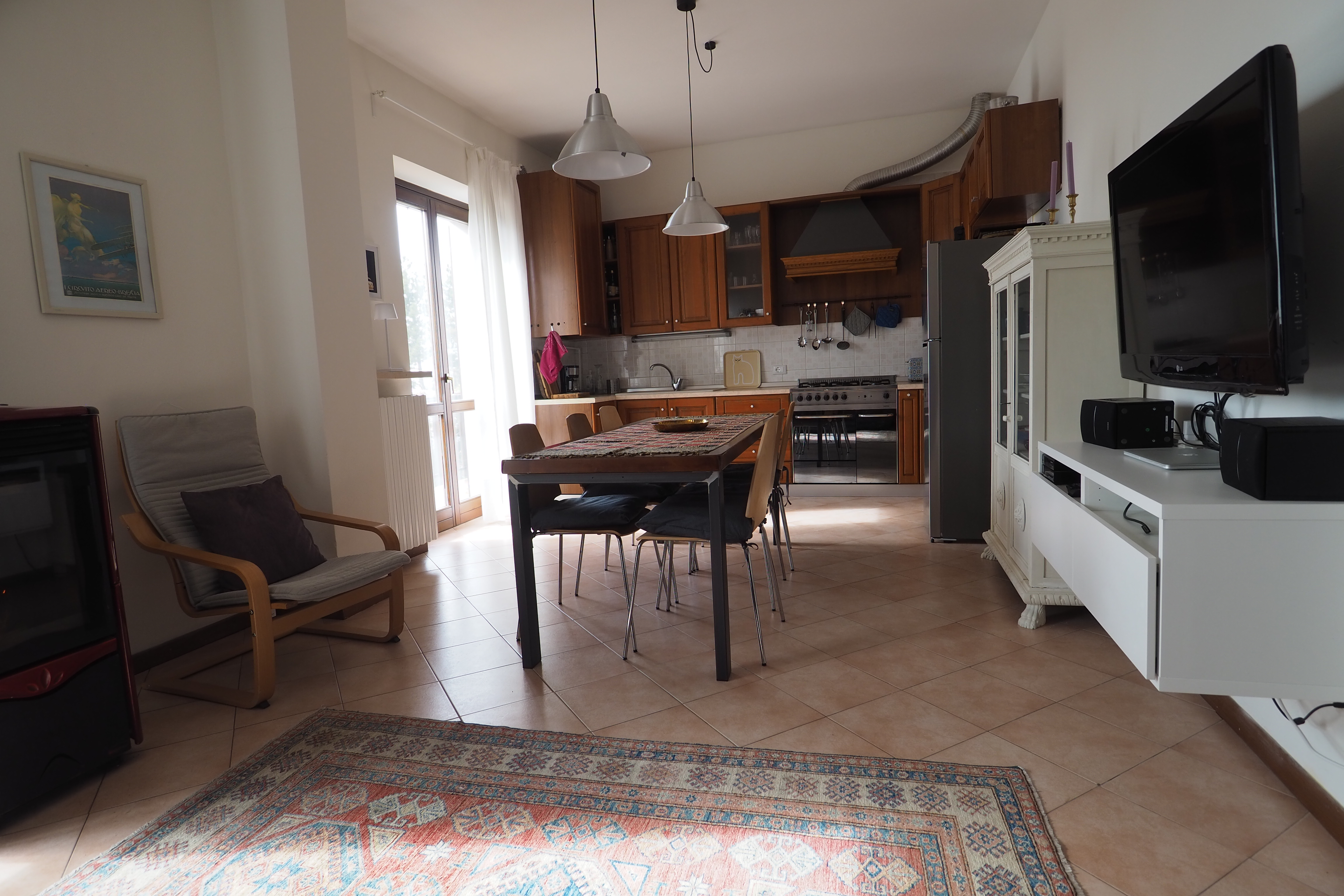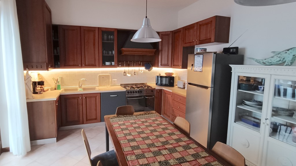 La nostra cucina soggiorno ha un tavolo con 6 posti, un divano a tra posto, una poltrona, la televisione, un tavolino, una libreria. Il piano di lavoro della cucina è dotato di: piano cottura a 5 fuochi, forno elettrico, microonde, frigorifero, lavastoviglie, bollitore, macchina per il caffè, tutto il necessario per cucinare (piatti, stoviglie, pentole, tazze, etc…)